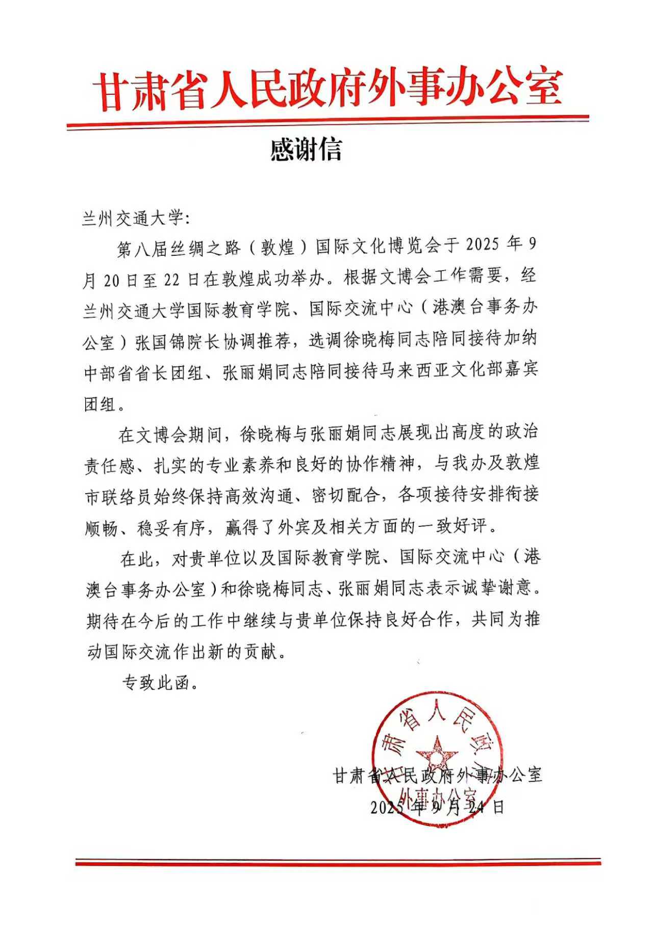 As a key institution of higher education in Gansu Province, Lanzhou Jiaotong University has long adhered to the educational philosophy of "Serving the Local Community and Contributing to Society," accumulating profound expertise and significant advantages in international exchange cooperation and foreign language talent cultivation. The two volunteer staff members selected for this event are a vivid reflection of the university’s high-quality talent development. They not only possess solid foreign language skills and can accurately express ideas in multiple languages but also have extensive experience in translation for large-scale international events. They are well-versed in foreign affairs reception etiquette and cross-cultural communication techniques.During their service at the expo, despite the high-intensity and demanding tasks, they consistently maintained enthusiastic dedication and fully engaged in all services. In receiving foreign guests, they were proactive, warm, and meticulous, providing thoughtful itinerary guidance and information consultation. During critical sessions such as discussions and cultural exhibition explanations, they demonstrated professional consecutive interpretation and accompanying translation skills, accurately conveying the perspectives and cultural connotations of both sides. They skillfully resolved potential communication barriers arising from cultural differences, ensuring efficient and smooth exchanges. Their rigorous and pragmatic work attitude, coupled with their professional and efficient service standards, fully showcased the positive spirit of Lanzhou Jiaotong University members and earned unanimous recognition and high praise from the staff of the Office of Foreign Affairs Commission of CPC Gansu Provincial Committee and the foreign guests in attendance. Office of Foreign Affairs Commission of CPC Gansu Provincial Committee expressed sincere gratitude for the strong support from Lanzhou Jiaotong University and highly commended the two translators for their "exceptional professional competence and outstanding service capabilities."